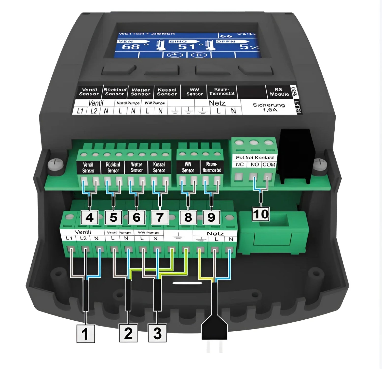 Das robuste Gehäuse aus hochwertigem Kunststoff gewährleistet einen zuverlässigen Betrieb, selbst bei extremen Temperaturen. Dadurch ist der Regler langlebig und widerstandsfähig, egal ob bei hohen oder niedrigen Außentemperaturen.