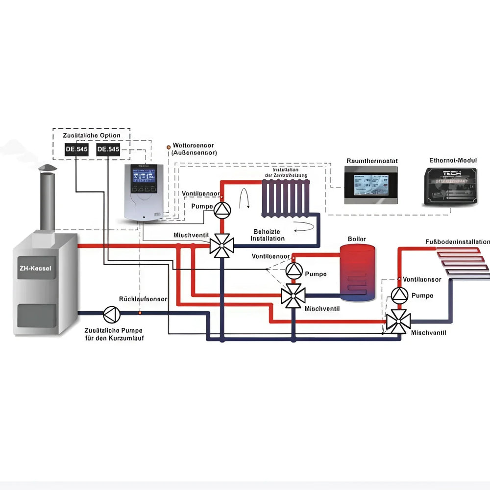 Den vejrkompenserende varmekredsstyring TECH i-1 CWU (EU-i-1 varmtvandsbeholder) Den styrer en 3/4-vejs blandeventil inklusive en ventilpumpe og en ekstra varmtvandspumpe. Via en udeføler (vejrkompensation), ugeprogram og tilslutning af rumtermostat opretholder den en stabil fremløbstemperatur og muliggør... Tilbagestrømningsbeskyttelse På kedlen. Ideel til modernisering og nybyggeri – for både private husejere og installatører.