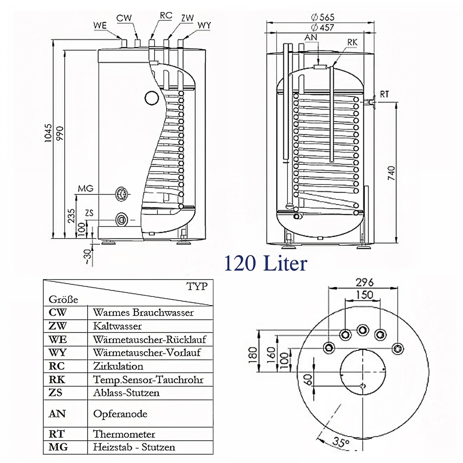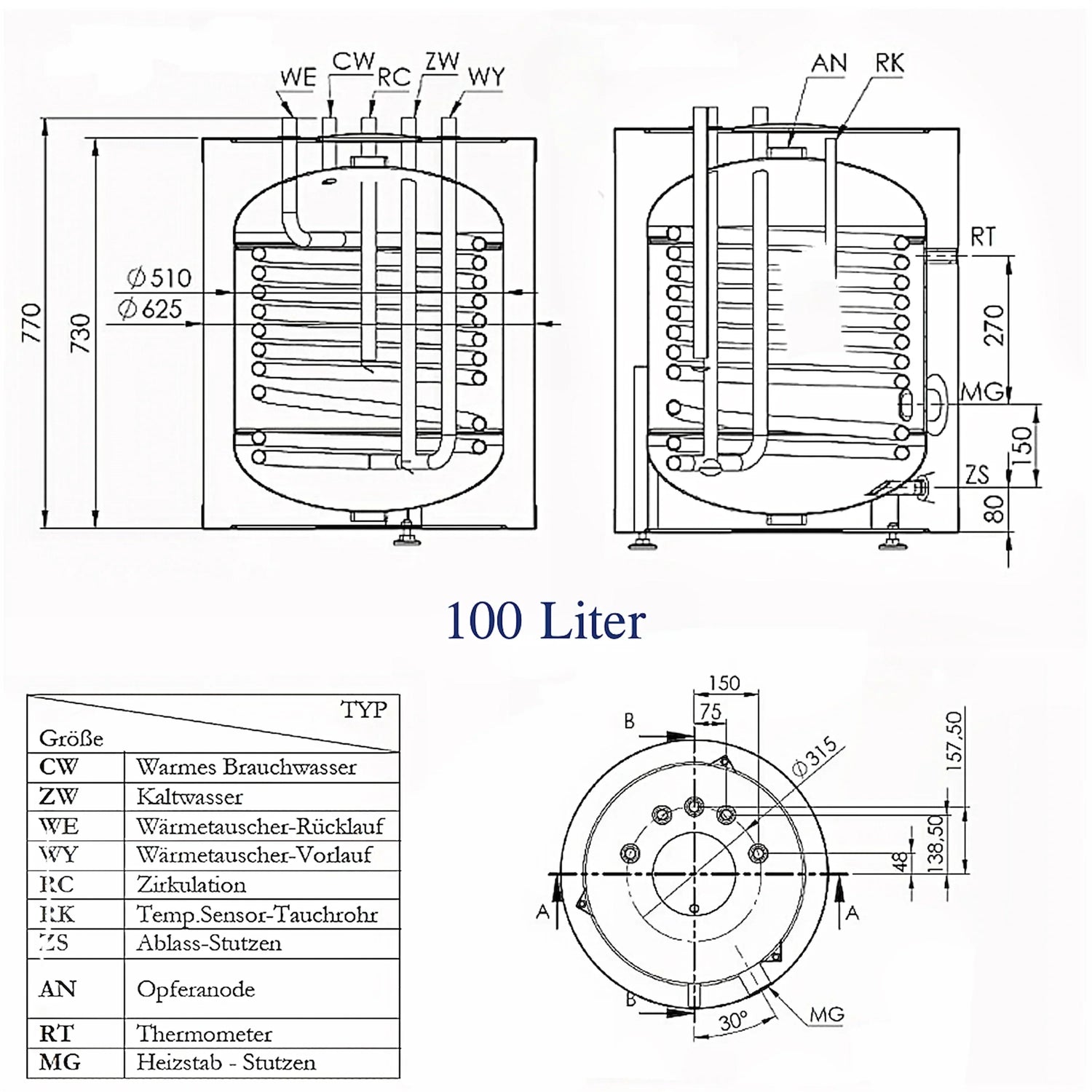 Ο Δεξαμενή ζεστού νερού 100 λίτρα, 120 λίτρα ή 150 λίτρα με 1 εναλλάκτη θερμότητας χρησιμοποιείται για κεντρική και ασφαλή θέρμανση ζεστού νερού.
