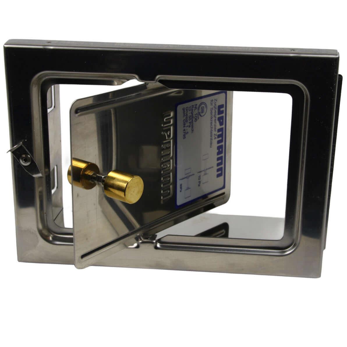 The Upmann Z4 draught regulator is approved for oil, gas, and all solid fuels, whether for new systems, renovations, or all conventional systems. These systems require a specific and consistent negative pressure to operate. If the chimney exceeds the value for optimal draught, the damper of the chimney draught regulator opens, reducing the negative pressure by allowing additional air to flow in. Once the preset value is reached, the damper of the Z4 draught regulator can be closed again. The Z4 draught regulator is made of stainless steel and designed for installation in the chimney cheek.