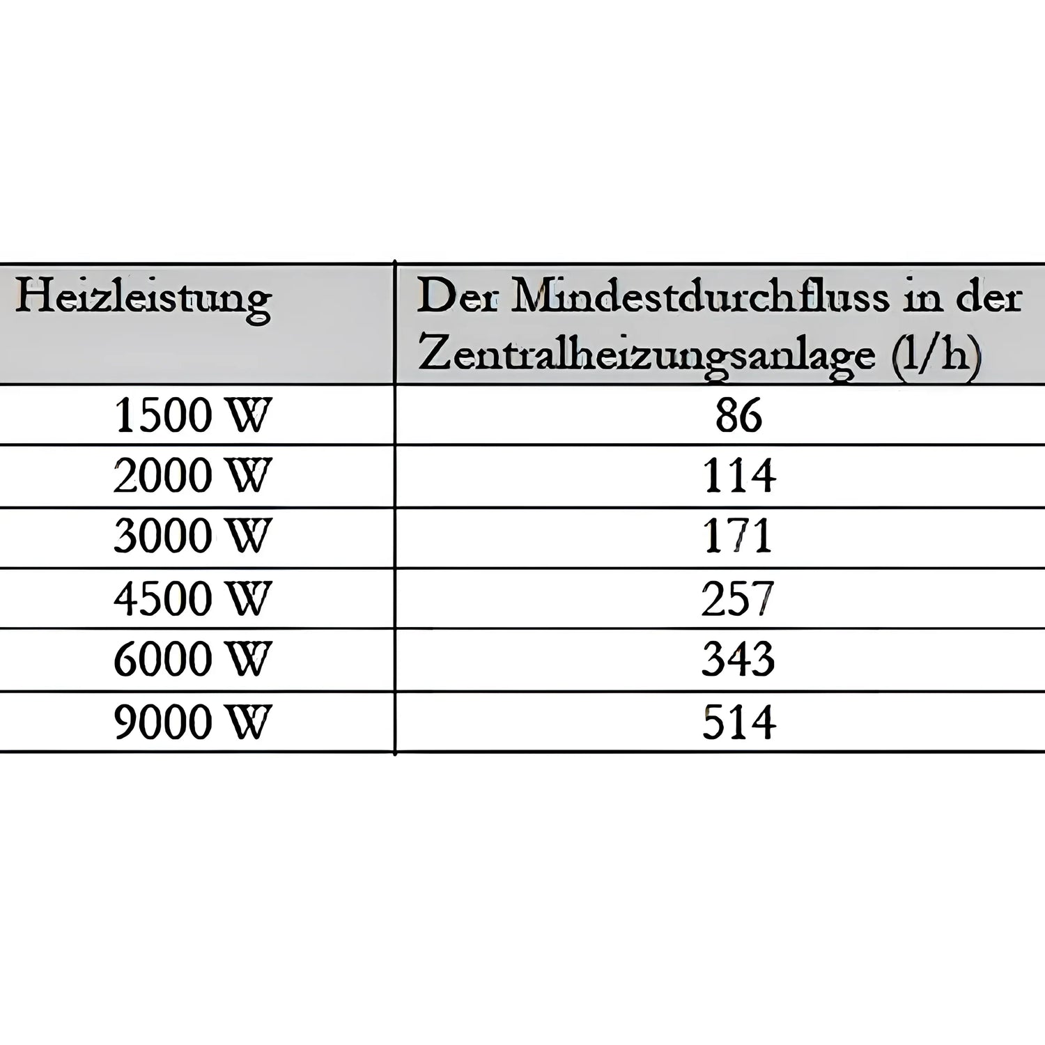 Le chauffe-eau instantané pour systèmes de chauffage central dispose d'options de raccordement précises : Le raccordement aller et retour mesure 1 1/4" IG, tandis que la connexion pour l'élément chauffant est réglée sur 1 1/2" IG. Il atteint une température de fonctionnement maximale admissible de 90 °C et fonctionne en toute sécurité jusqu'à une pression de service de 10 bars.