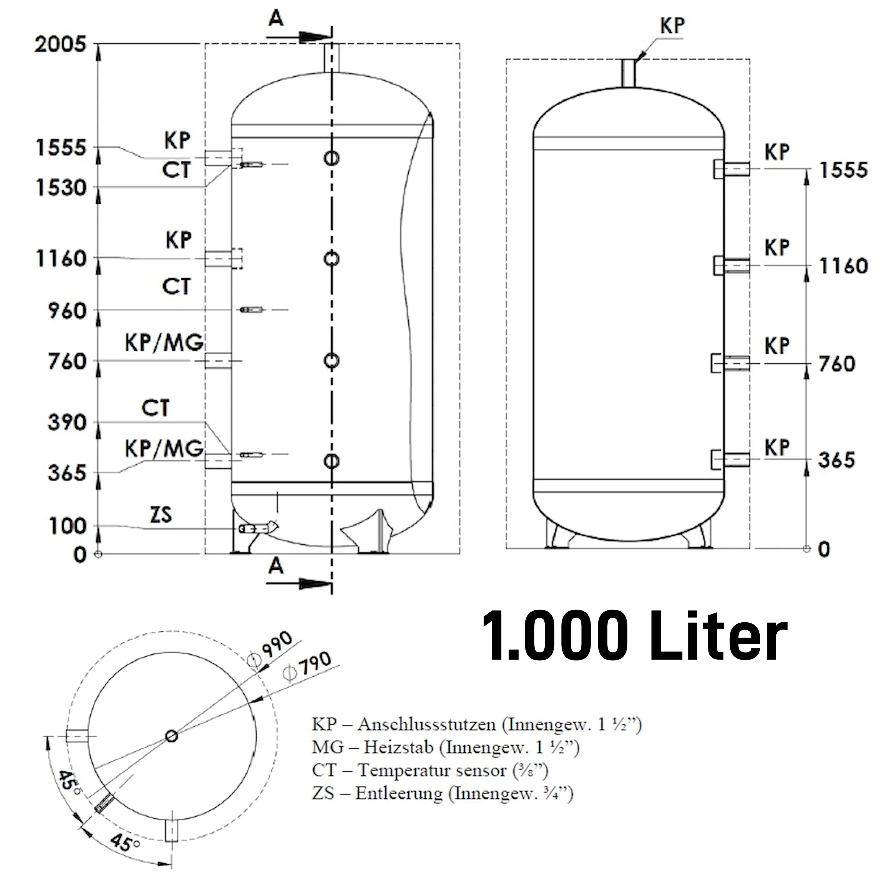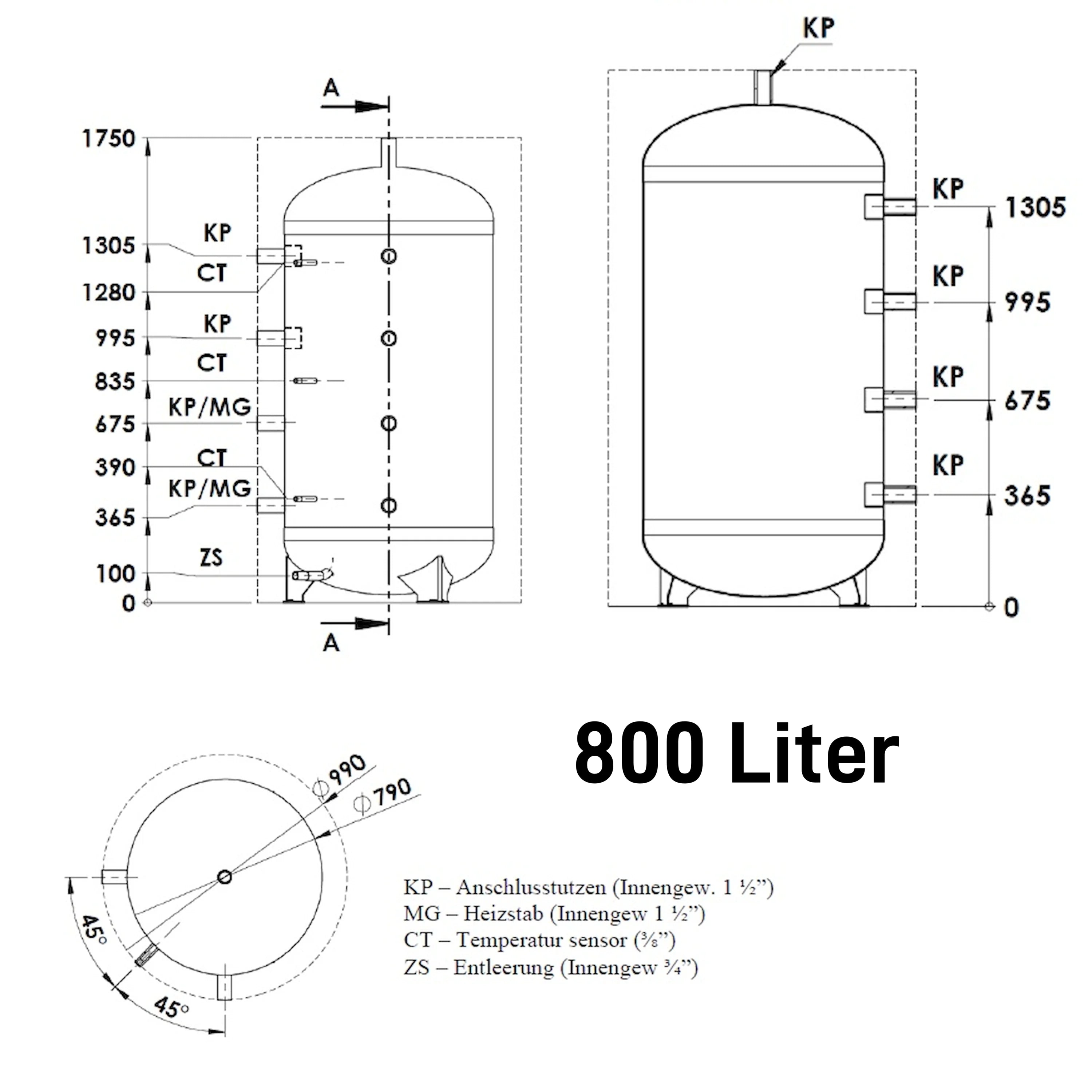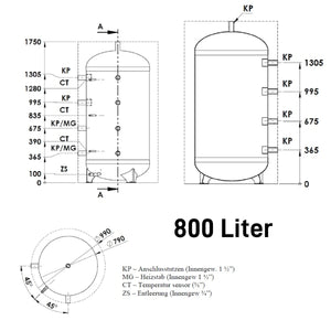 Toisí nasc: Píosa nasc (KP) snáithe inmheánach 1½", nasc eilimint téimh (MG) snáithe inmheánach 1½", nasc braiteoir teochta (CT) 3/8", Snáithe inmheánach draein (ZS) 3/4".