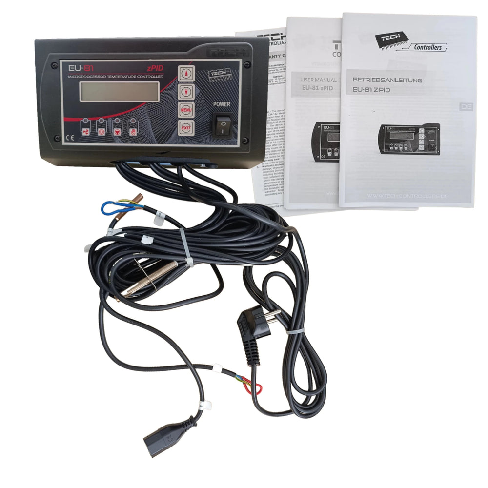 Regulatorul TECH EU-81 este furnizat ca o soluție completă și include toate componentele esențiale pentru utilizare imediată. Livrarea standard include regulatorul de temperatură, senzori de temperatură pentru încălzire centrală și apă caldă menajeră și un manual de utilizare ușor de înțeles.