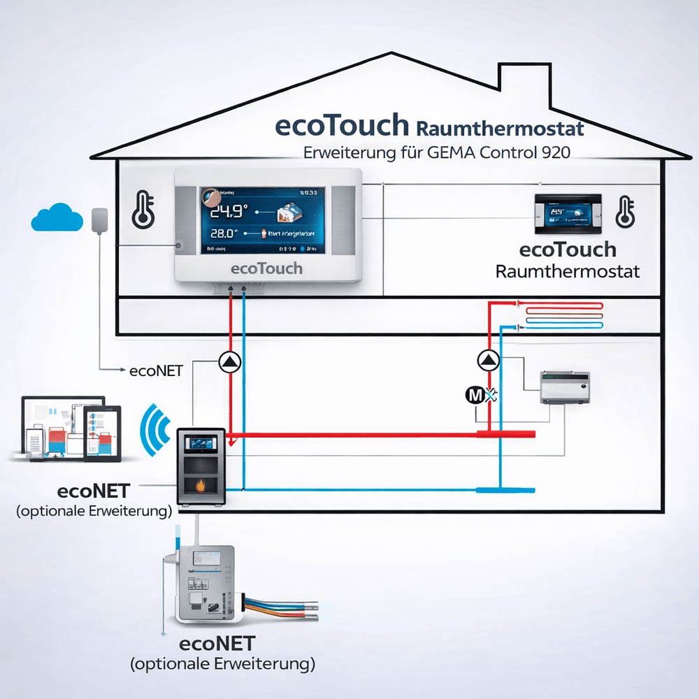 De PLUM ecoTouch rumstermostatförlängning GC920 är ett funktionellt tillägg för GEMA Control 920 värmeregleringDen kombinerar en rumsgivare och rumstermostat i en enhet, vilket möjliggör bekväm och exakt temperaturreglering direkt i rummet.